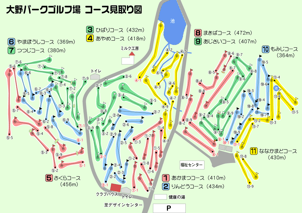 約9.2haのエリアに11コース・99ホール。全国大会も開催される本州一大きなコースです。休憩施設やトイレも完備されています。
